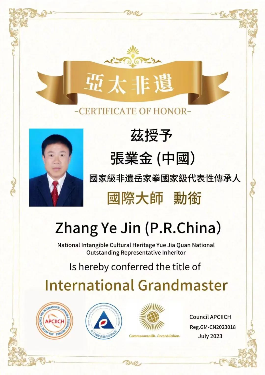 7月13日中国国家级非物质文化遗产岳家拳国家级代表性传承人 、澳大利亚武术委员会副主席 、中国岳飞文武学院董事长张业金大师荣获2023亚太非遗国际大师认证勋衔,旨在表彰他为岳家拳的传承发展做出的卓越国际贡献和辉煌成就。